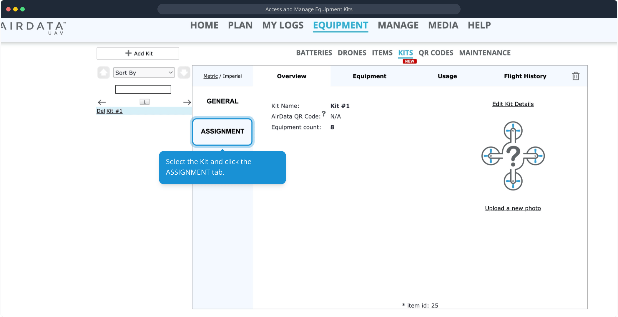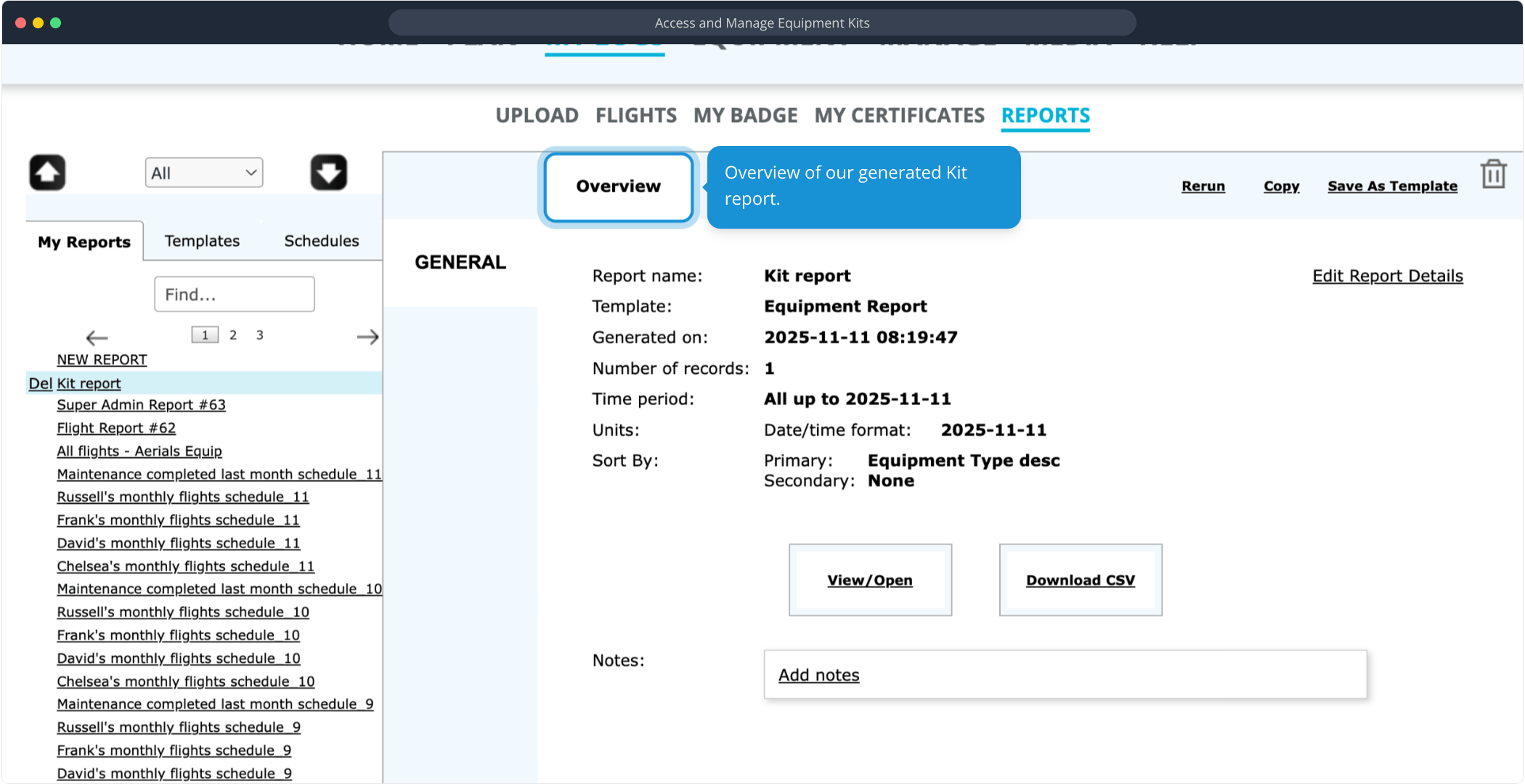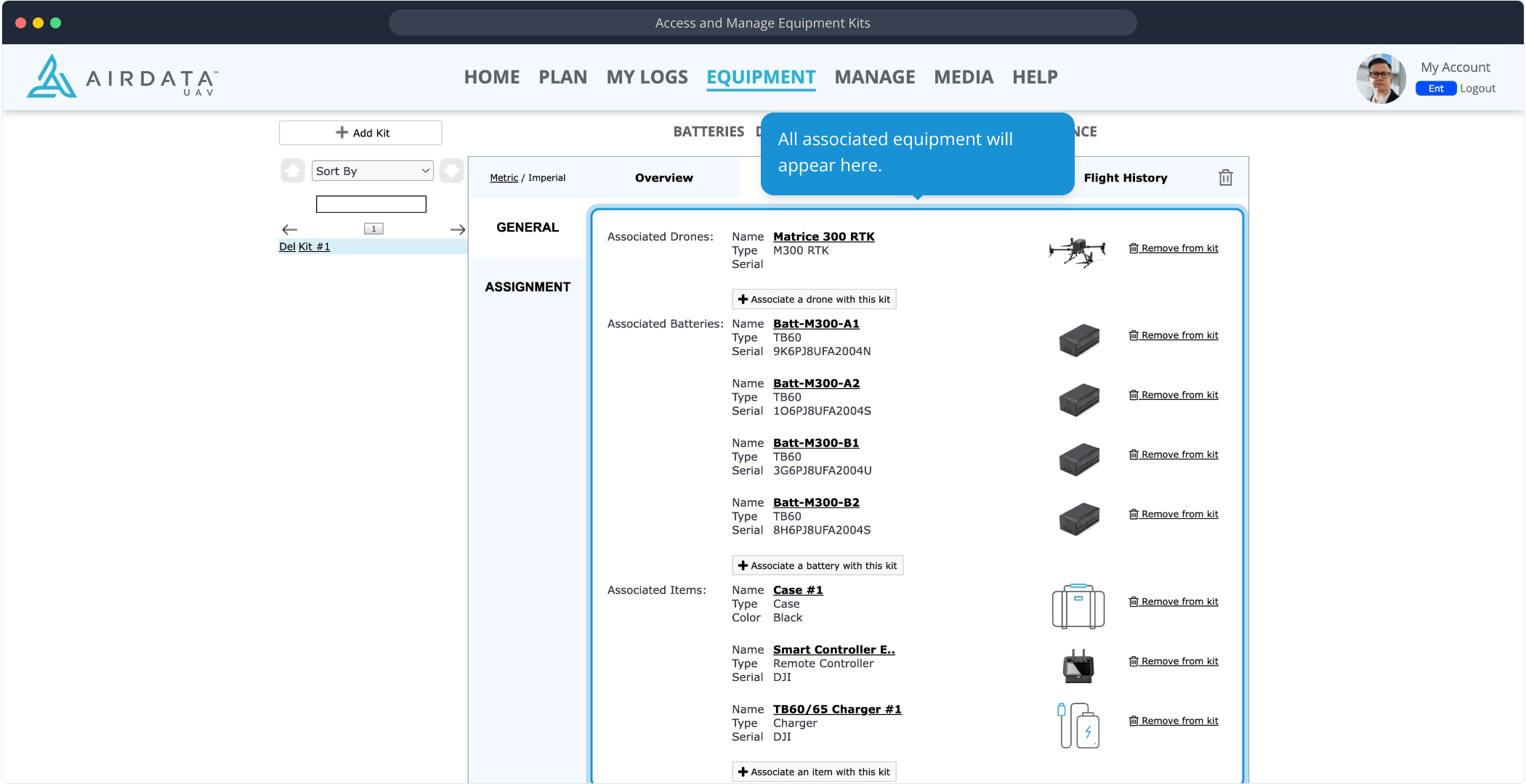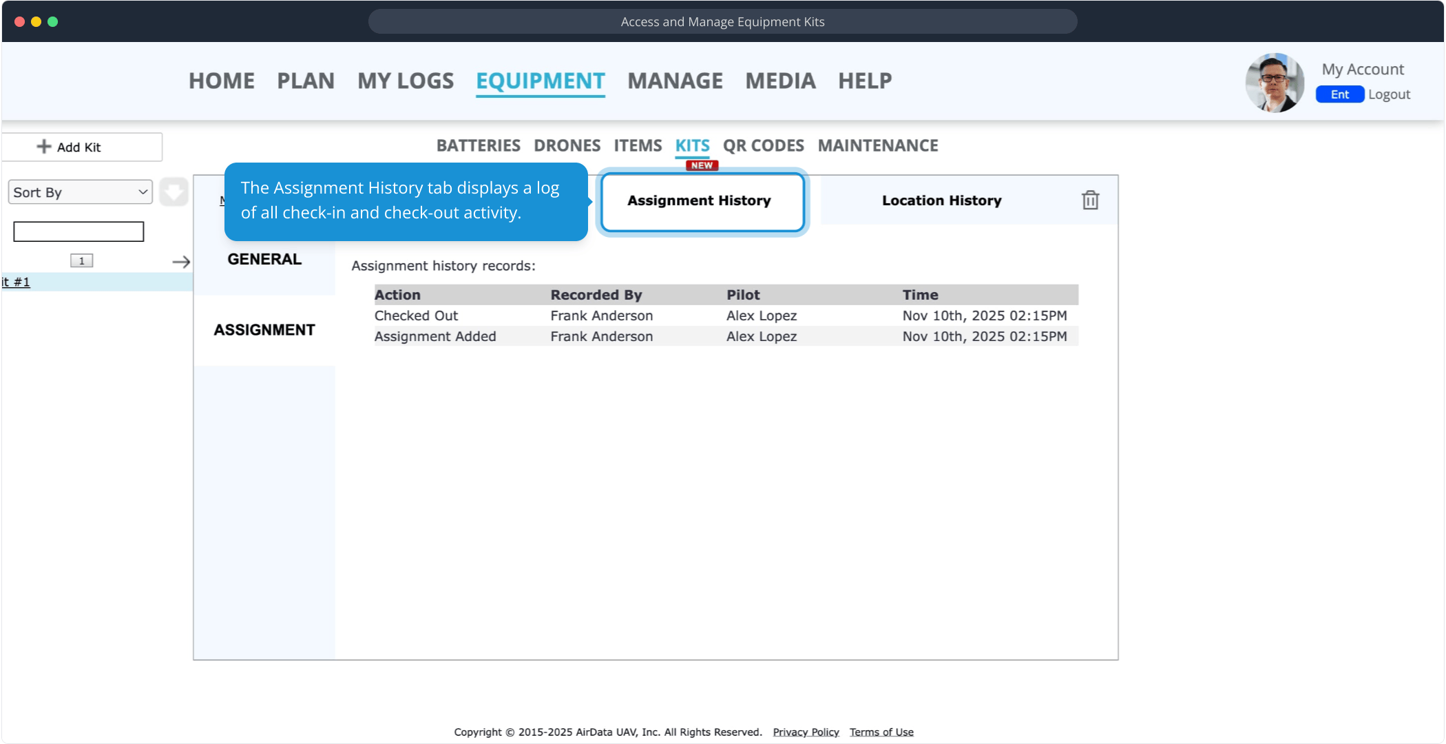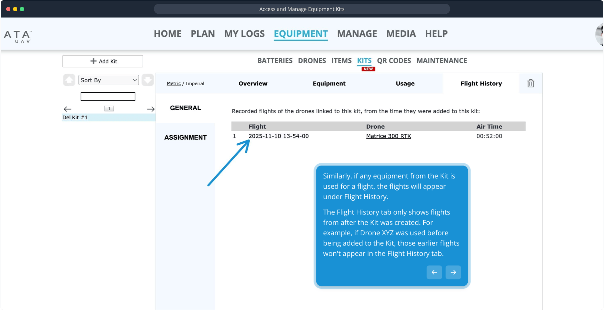 Similarly, if any equipment from the Kit is used for a flight, the flights will appear under Flight History.