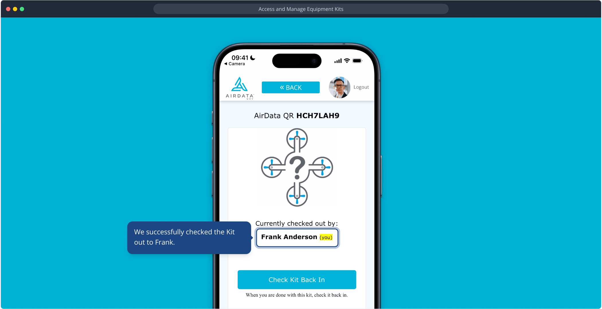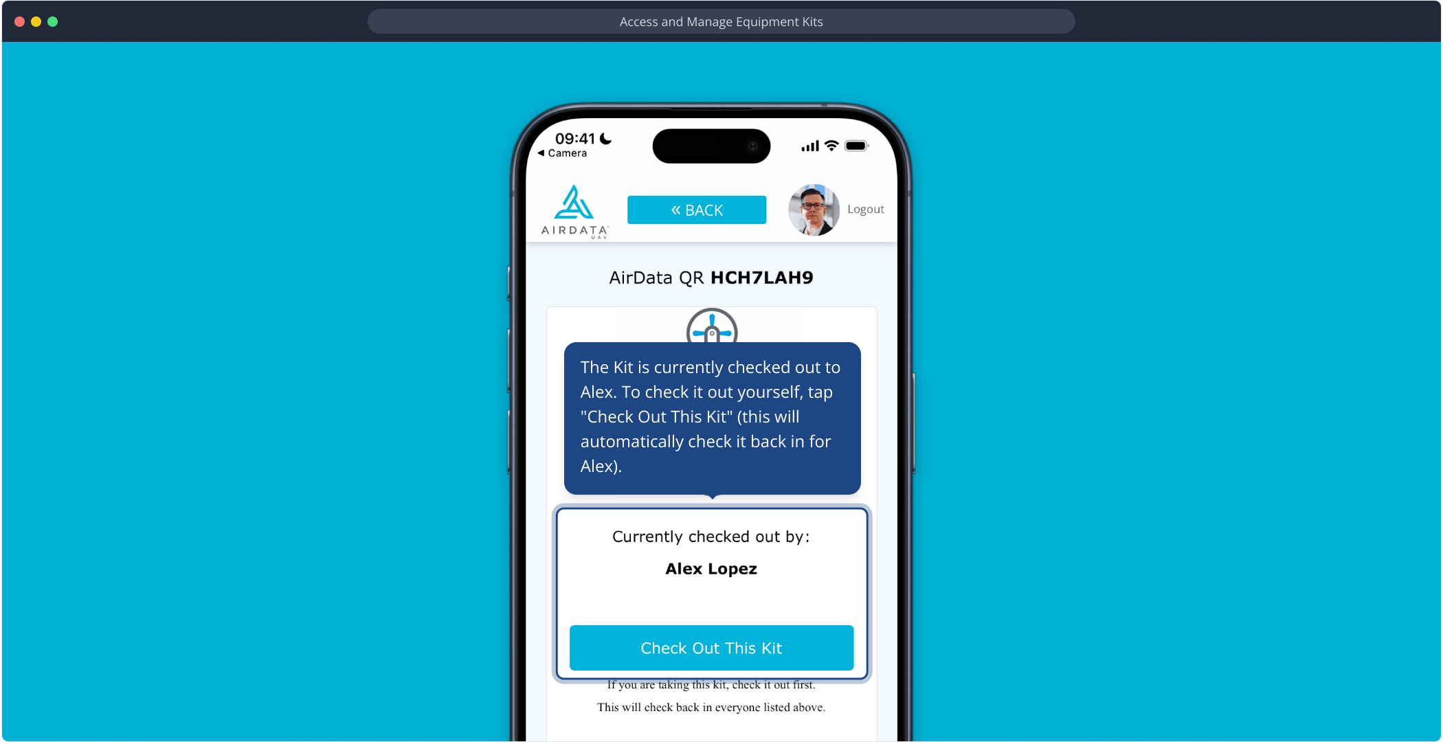 The Kit is currently checked out to Alex. To check it out yourself, tap "Check Out This Kit" (this will automatically check it back in for Alex).