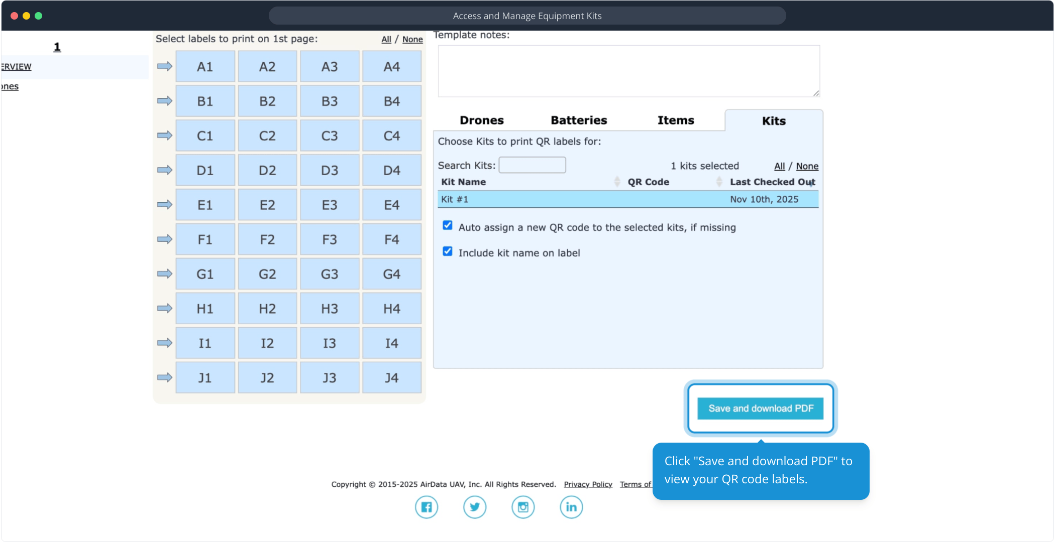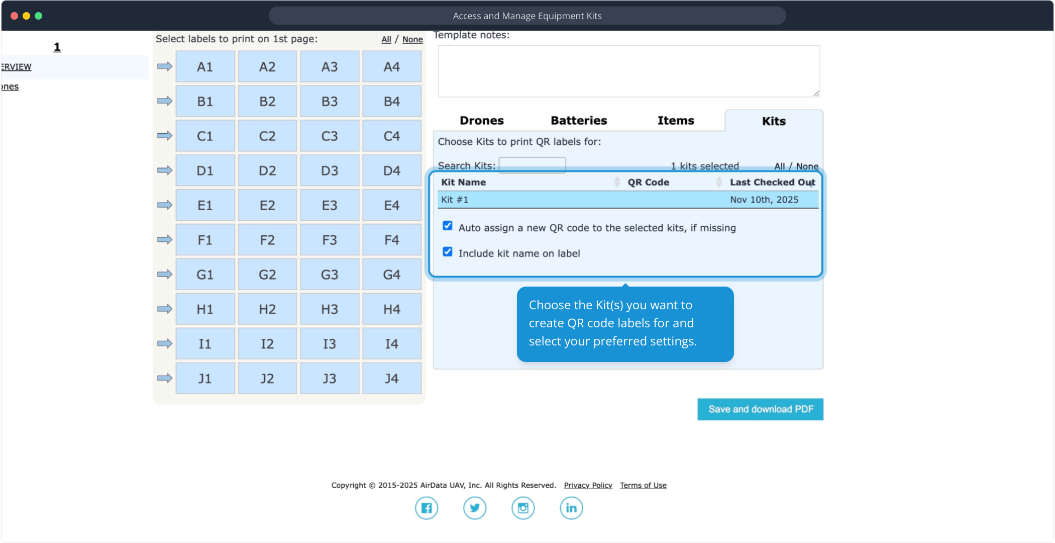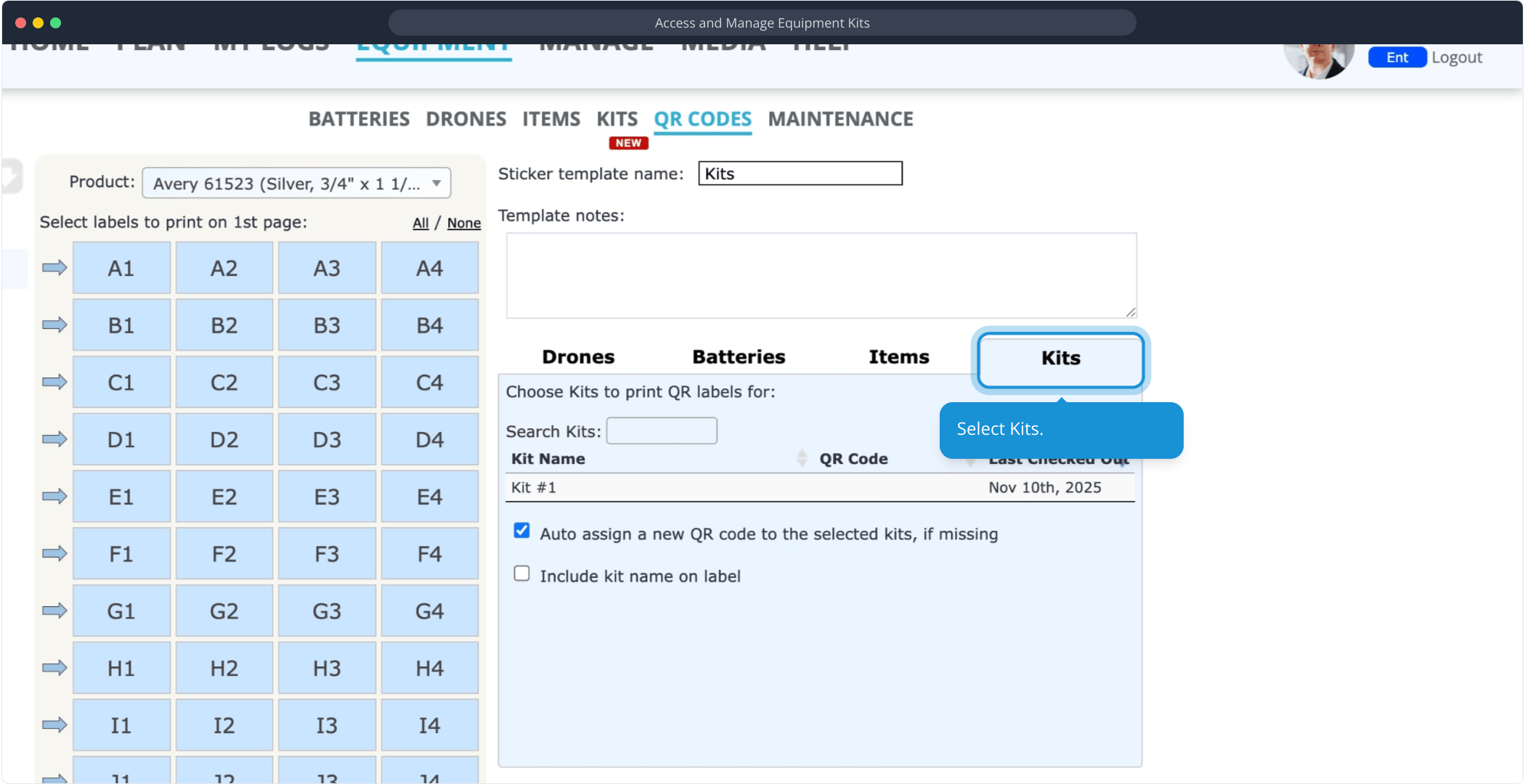 Choose the Kit(s) you want to create QR code labels for and select your preferred settings.