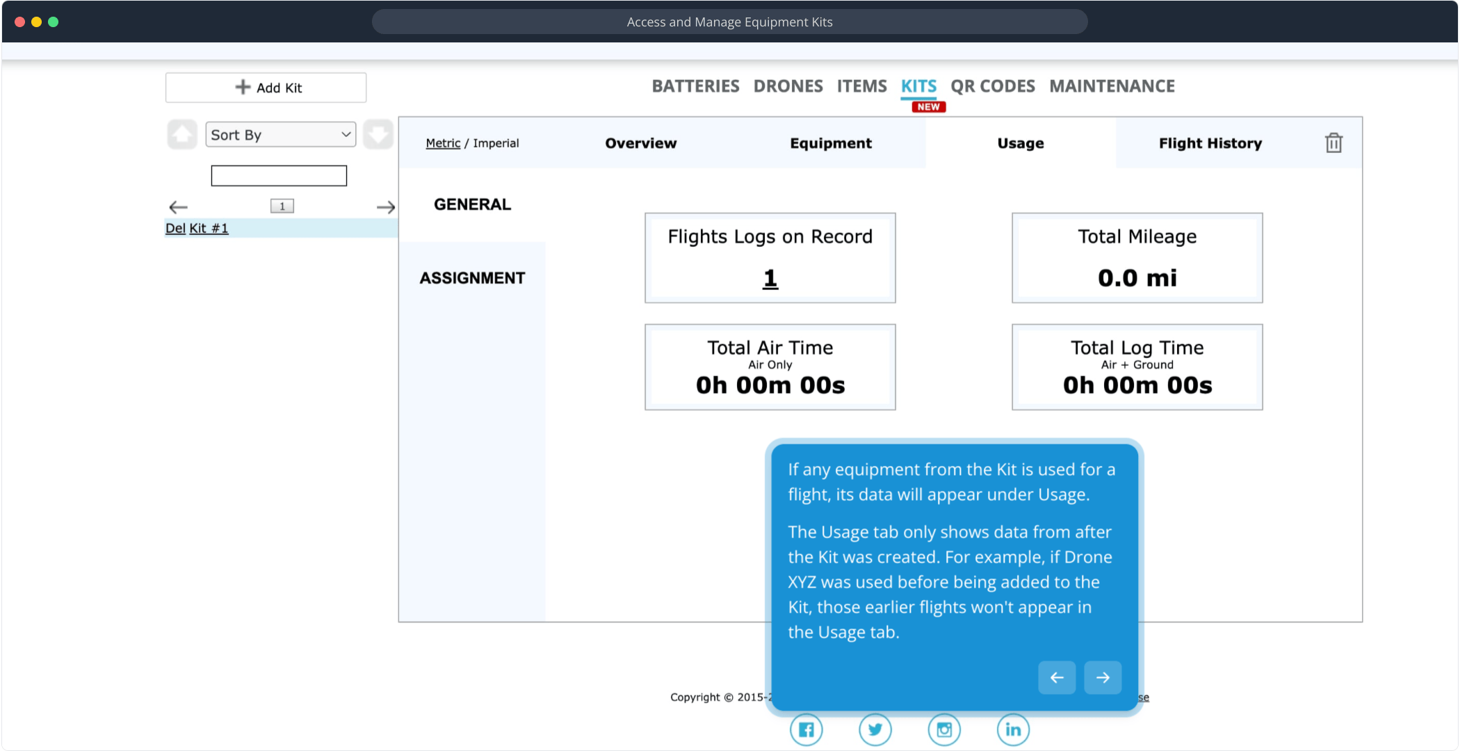 The Usage tab only shows data from after the Kit was created. For example, if Drone XYZ was used before being added to the Kit, those earlier flights won't appear in the Usage tab.