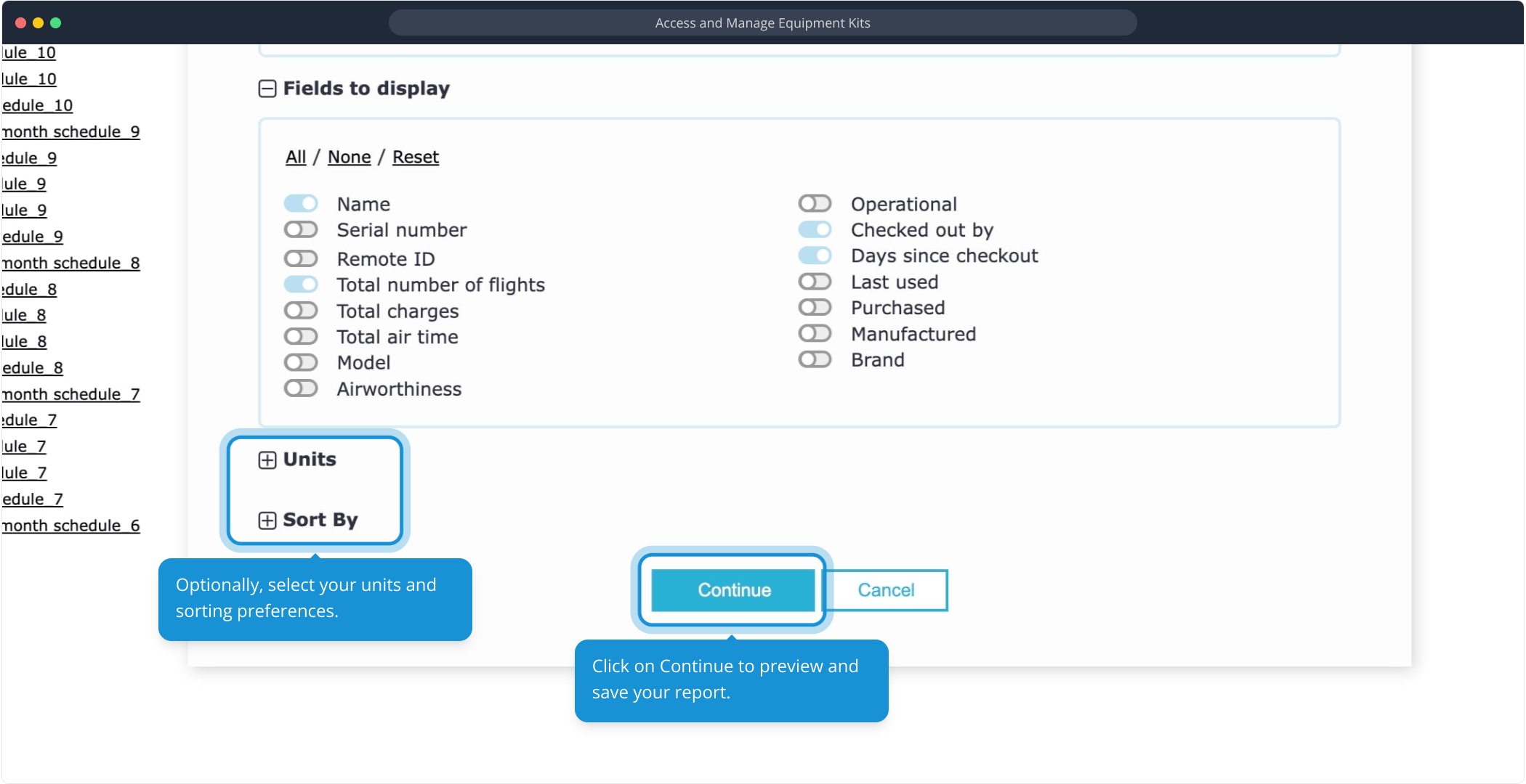 Optionally, select your units and sorting preferences. Click on Continue to preview and save your report.