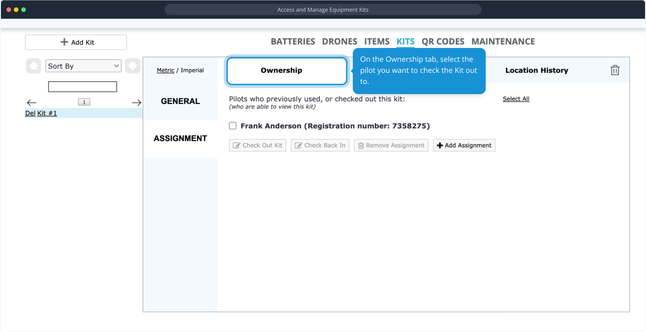 On the Ownership tab, select the pilot you want to check the Kit out to.