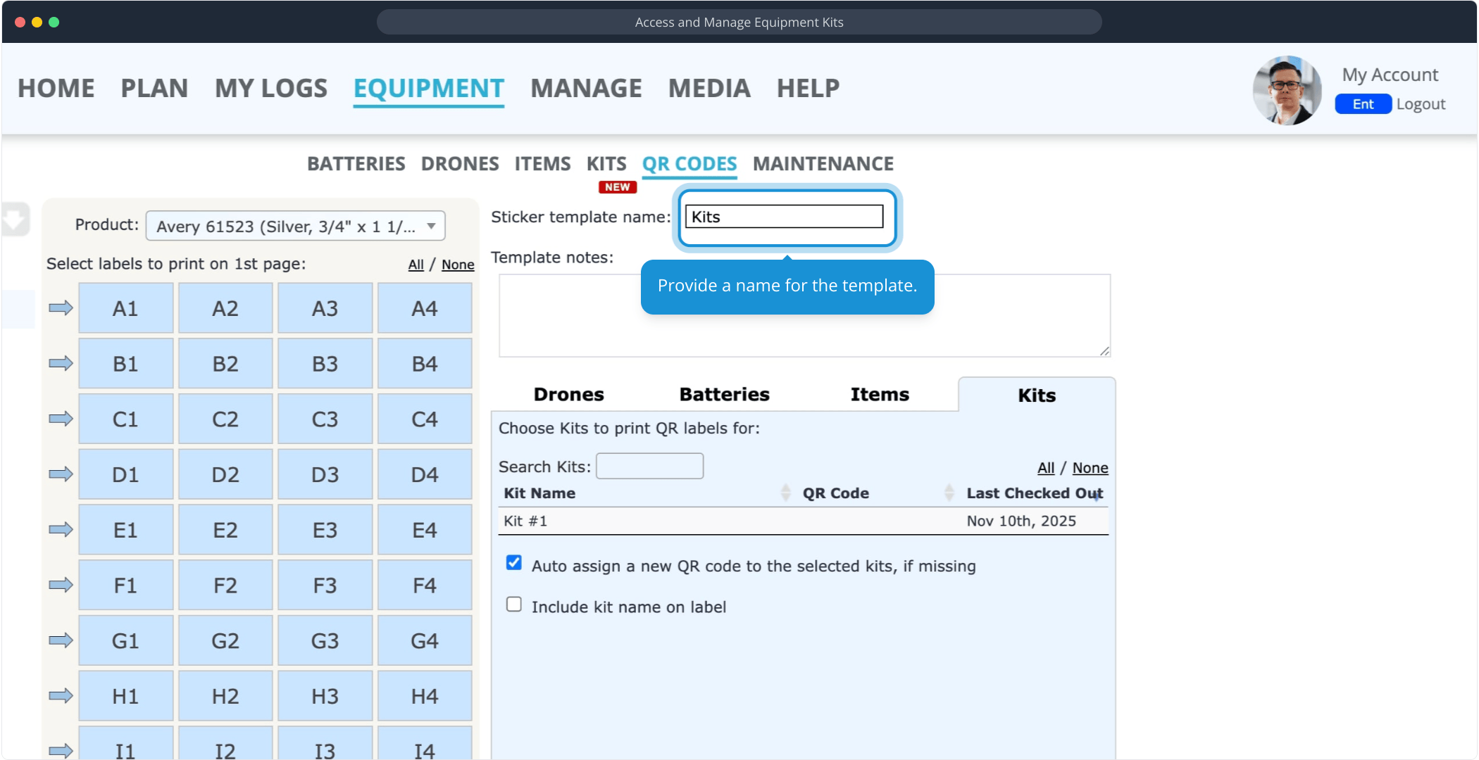 Go to EQUIPMENT → QR CODES and select the Robust QR Code template.