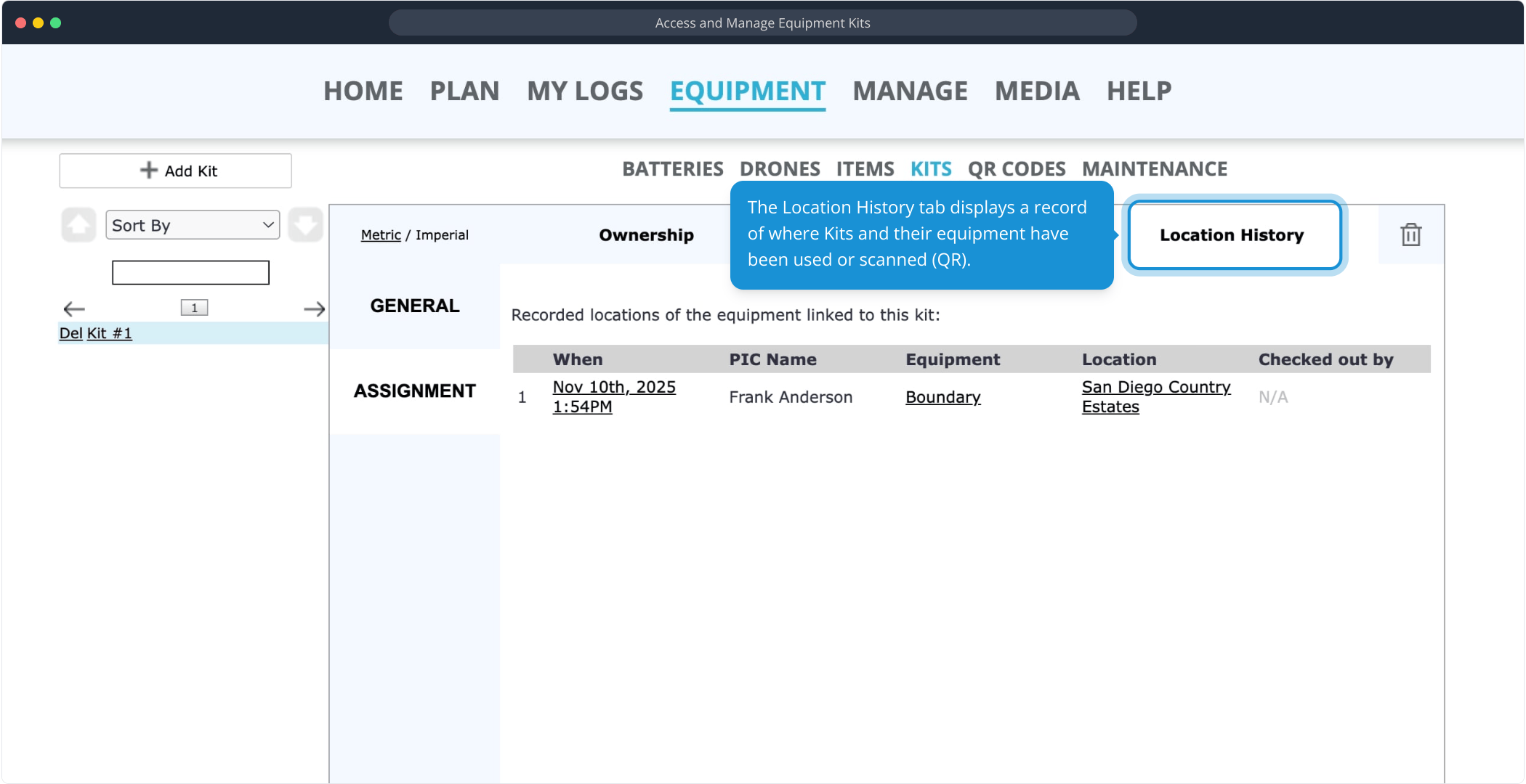 The Location History tab displays a record of where Kits and their equipment have been used or scanned (QR).
