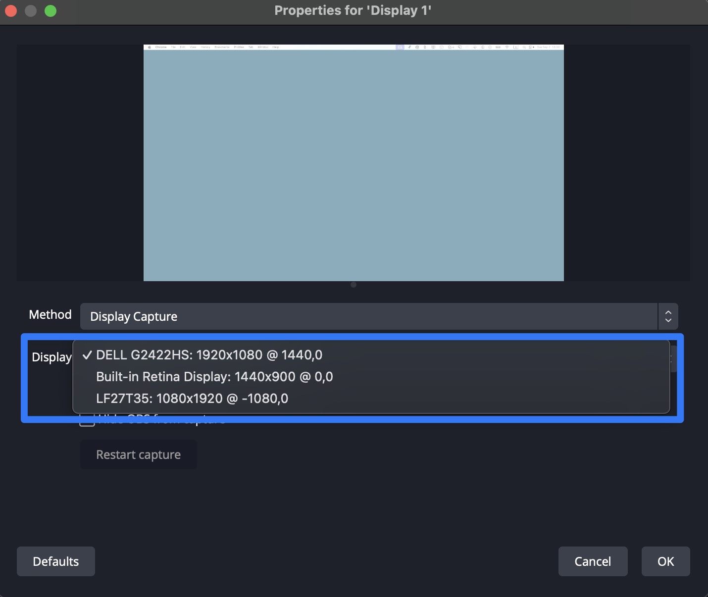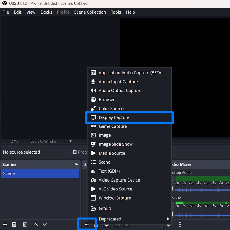 Click the “+” button in the bottom left of OBS and select “Display Capture”.