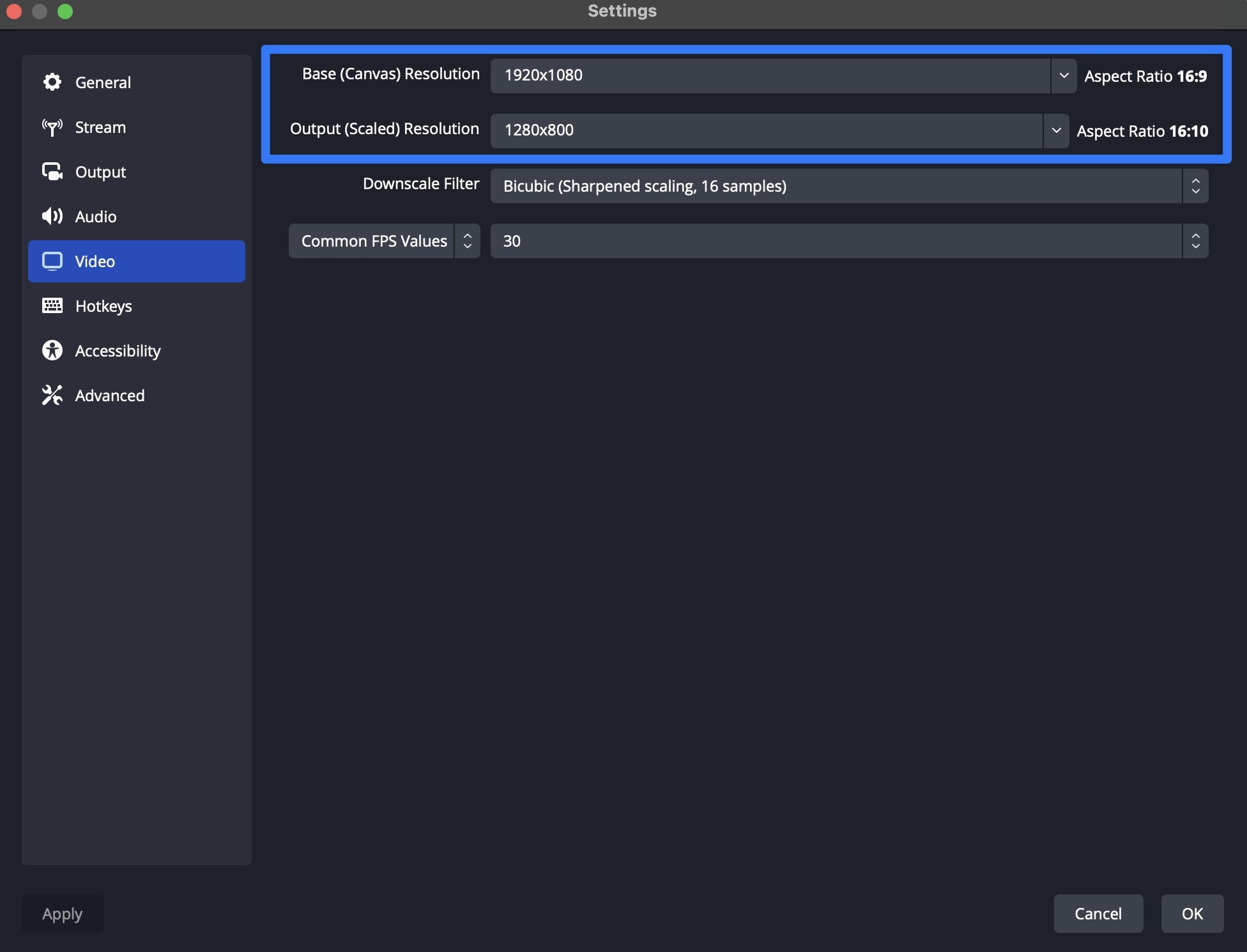 1. Configure your Video settings in OBS.