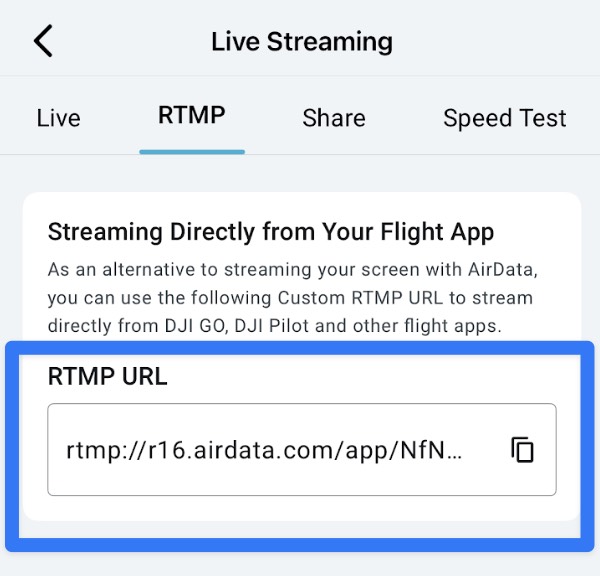 To locate your AirData RTMP URL, head to the AirData mobile app, then tap: Start -> Live Streaming -> Go Live -> RTMP